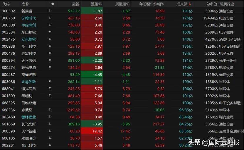 个股方面,系数2378只收涨,涨停股86只;2960只个股收跌,跌停股10只。14只个股日成交额不低于100亿元,新易盛跌近2%,天孚通讯跌逾2%,宁德时间、阳光电源、东山精密、胜宏科技均说明可以,华工科技涨近8%。
