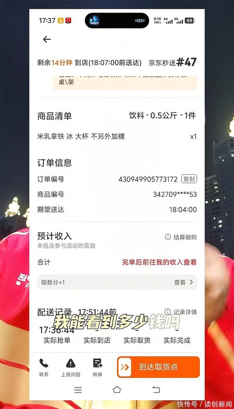 ↑ 京东骑手在短视频晒出订单截图骄慢,未运行配送前骑手看不到单价。